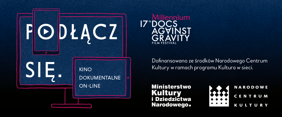 „Podłącz się. Kino dokumentalne on-line” to projekt, który jest zwieńczeniem tegorocznej edycji Festiwalu Filmowego Millennium Docs Against Gravity. Do końca października widzowie będą mogli zobaczyć w wolnym dostępie kilkanaście wyjątkowych filmów dokumentalnych o wysokiej jakości edukacyjnej. W tym czasie odbywają się także warsztaty z krytyki filmowej oraz spotkania z ekspertami, które pomogą lepiej zrozumieć prezentowane w filmach zagadnienia. Projekt dofinansowano ze środków Narodowego Centrum Kultury w ramach programu Kultura w sieci.