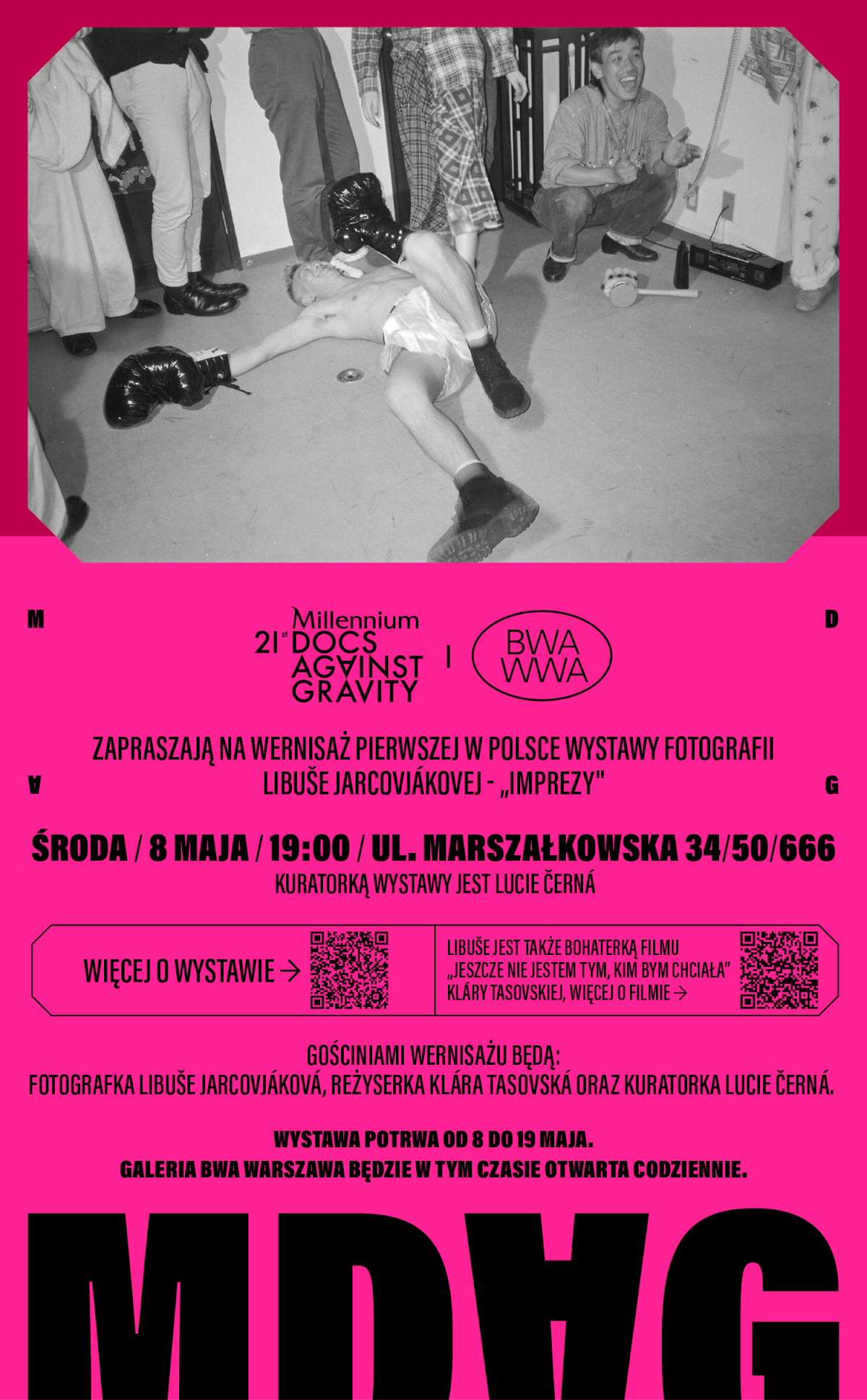Z kolei wystawa Libuše Jarcovjákovej „Imprezy” dopełnia obraz życia i twórczości artystki, który został przedstawiony w filmie „Jeszcze nie jestem tym, kim bym chciała” („I'm Not Everything I Want to Be”, reż. Klara Tasovská). Wystawa potrwa od 8 do 19 maja w BWA Warszawa. Wernisaż odbędzie się 8 maja o 19:00. W przypadku obu fotografek są to pierwsze wystawy ich prac w naszym kraju.